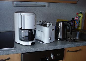 - Küchenzeile mit Geschirr, Geschirrspülmaschine, Kühlschrank mit Gefrierfach, 2-Platten E-Herd und Mikro/Kombibackofen
